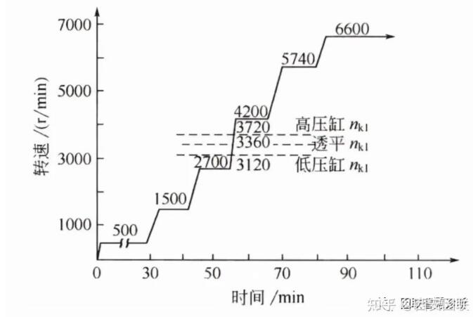 (如圖1所示的空氣壓縮機升速曲線)。在升速同時對機組運行情況進行全面檢查,一切正常才可繼續(xù)升速,直到調(diào)速器起作用的最低轉(zhuǎn)速(設(shè)計轉(zhuǎn)速的85%左右)。通過臨界轉(zhuǎn)速要適當迅速,嚴密注意機組的振動情況。